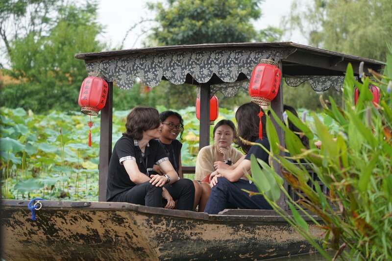 7月27日,来自成都国际友好城市的青年代表乘坐乌篷船泛舟荷塘。李珺 / 摄