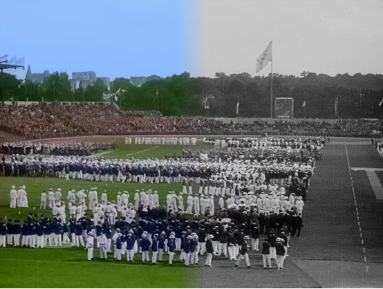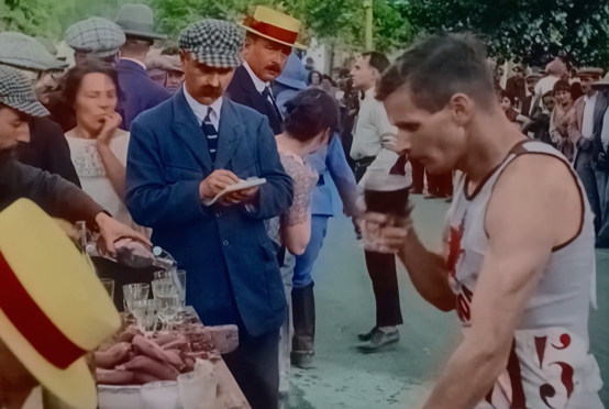 修复后的历史影像清晰展现了100年前巴黎奥运会开幕式入场仪式。田径项目是赛事的焦点,在AI云技术的加持下,观众可以欣赏彩色版1924年巴黎奥运会田径巨星们惊人的力量、速度和耐力。影像还显示,当时的马拉松赛中,运动员喝红酒作为赛中补给。