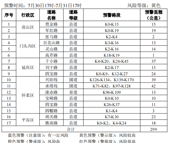 记者从北京市规划和自然资源委员会、北京市气象局了解到,7月30日17时至7月31日17时,北京市怀柔南部,密云大部,平谷北部发生崩塌、滑坡、泥石流等地质灾害的风险高(橙色预警),房山中部,门头沟东部,石景山、海淀西北部,昌平大部,延庆东部,顺义东北部,平谷大部发生崩塌、滑坡、泥石流等地质灾害的风险较高(黄色预警);房山西部和北部,门头沟中西部,丰台西北部,延庆西部和北部,怀柔北部有发生崩塌、滑坡等地质灾害的风险(蓝色预警),请注意防范。