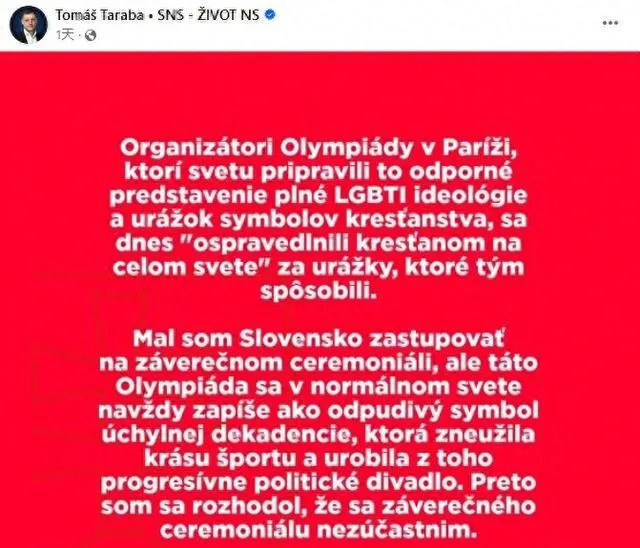RT介绍道,斯洛伐克总理罗贝尔特·菲佐5月遭遇刺杀后,塔拉巴暂行部分总理职务,并受命代替菲佐前往巴黎。他在Facebook上写道:“我本该代表斯洛伐克出席闭幕式,但对于正常的世界来说,这届奥运会将永远是堕落、颓废的象征,它滥用了体育之美,将其变成了所谓进步的政治舞台。因此,我决定不参加闭幕式。”