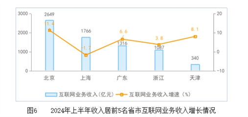 超半数地区互联网业务实现正增长。上半年,互联网业务累计收入居前5名的北京(增长11.4%)、上海(下降1.7%)、广东(增长6.6%)、浙江(增长3.8%)和天津(增长8.1%)共完成业务收入7158亿元,同比增长5.7%,占全国(扣除跨地区企业)互联网业务收入的82.5%。全国互联网业务收入实现正增长的省(区、市)有16个,其中甘肃、安徽增速超30%,山西、新疆、西藏降幅超30%。
