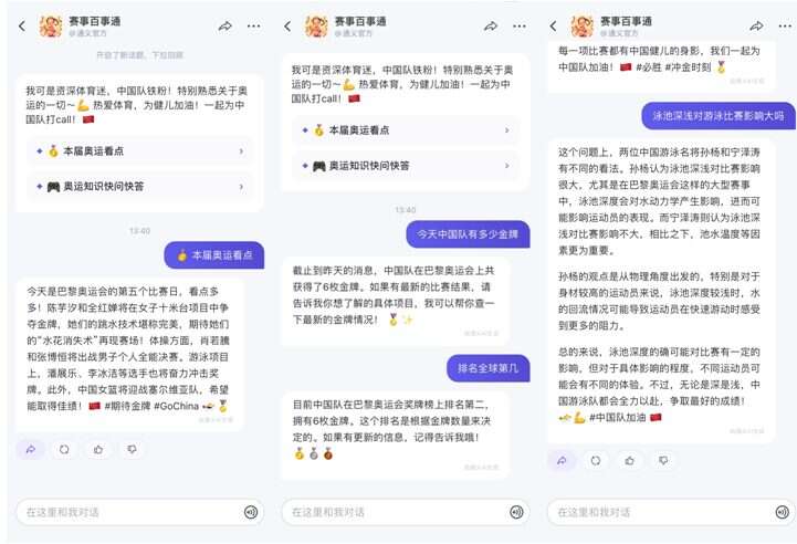 通过奥运专项强化训练,通义大模型已具备业界最强奥运专业知识,可以最快地回答奥运相关的各种问题。在通义APP的主搜索和“赛事百事通”功能中,用户无论查询各类赛事知识,还是了解各国运动员和赛事历史,只需简单提问,就能获得详尽且专业的答案。