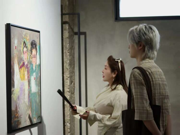 中国艺术家徐梦瑶带着她的新作《埃菲尔铁塔牵手牡丹亭》参展。作品以代表中国文化的昆曲元素为主题,描绘了昆曲《牡丹亭》中杜丽娘和柳梦梅手持象征法国的红酒酒杯,款款而来的场景。画面中,埃菲尔铁塔线条爽利,颇具力量感。