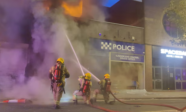 据媒体报道,反移民示威者在桑德兰市向身穿防暴装备的警察投掷石块,随后掀翻车辆,点燃一辆汽车,并在一所警察局附近纵火。