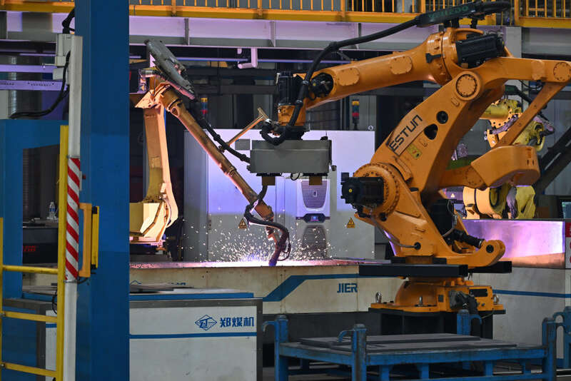 货车司机把板材运至工厂后,机器人自动从货车上拾取板材,并按厚度、材质等分别堆放至智能仓储区;依托5G通信系统和物联网系统,工厂的激光切割生产线、智能焊接生产线,均由机器人完成。