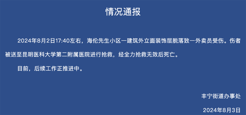 8月3日,昆明市五华区丰宁街道办事处发布情况通报,2024年8月2日17:40左右,海伦先生小区一建筑外立面装饰层脱落致一外卖员受伤。伤者被送至昆明医科大学第二附属医院进行抢救,经全力抢救无效后死亡。目前,后续工作正推进中。