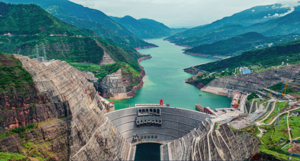 在云南省巧家县和四川省宁南县交界的金沙江峡谷中,上游而来的金沙江水被白鹤滩水电站大坝截住,“高峡出平湖”的景色蔚为壮观。白鹤滩水电站年均发电量可达624亿千瓦时,是金沙江峡谷中的“绿色引擎”之一。