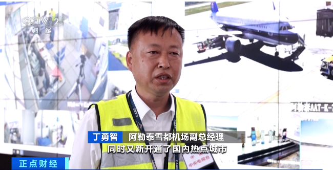 阿勒泰雪都机场副总经理 丁勇智:原有的航线大部分进行了加密,同时又新开通了国内热点城市直飞阿勒泰的航线,选择性灵活度更高了,促使今年来的游客更多了,与去年相比增长了35%左右。
