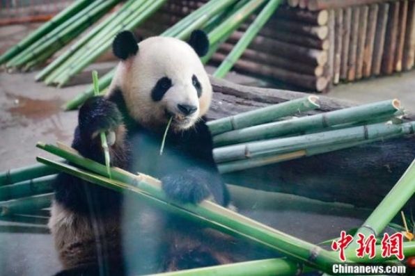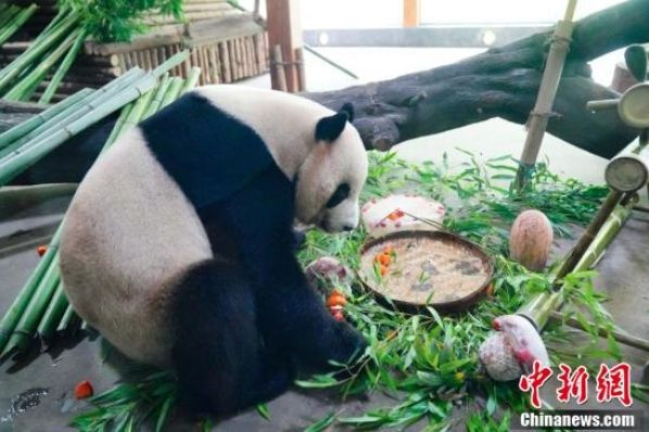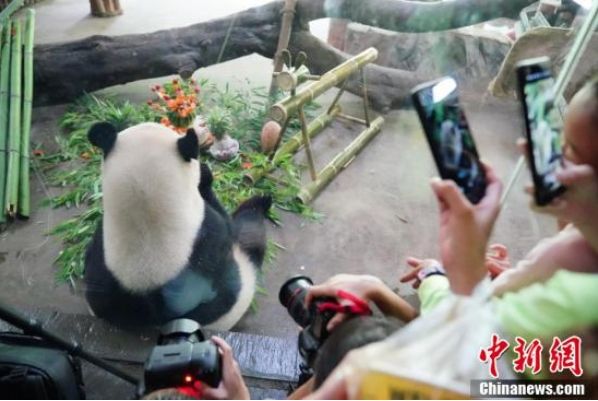8月4日,在昆明生活的大熊猫珍多迎来10岁生日,众多市民和游客来到云南野生动物园,为珍多送上生日祝福。图为珍多专心享用美食。