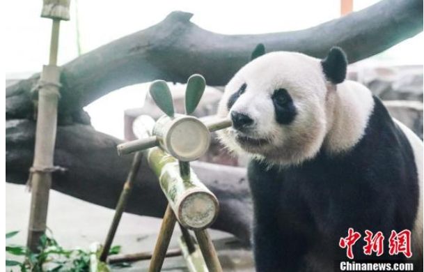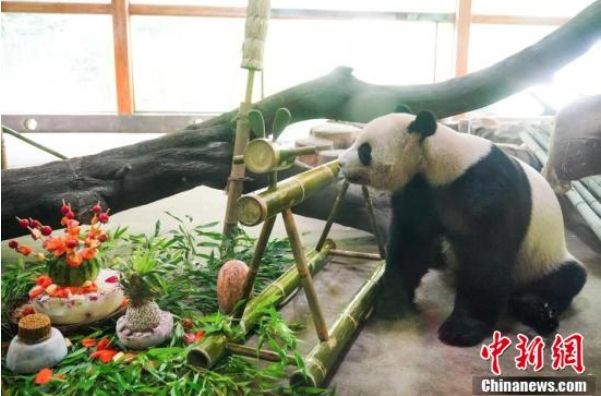 8月4日,在昆明生活的大熊猫珍多迎来10岁生日,众多市民和游客来到云南野生动物园,为珍多送上生日祝福。图为保育员为珍多准备了生日礼物和特制“蛋糕”。