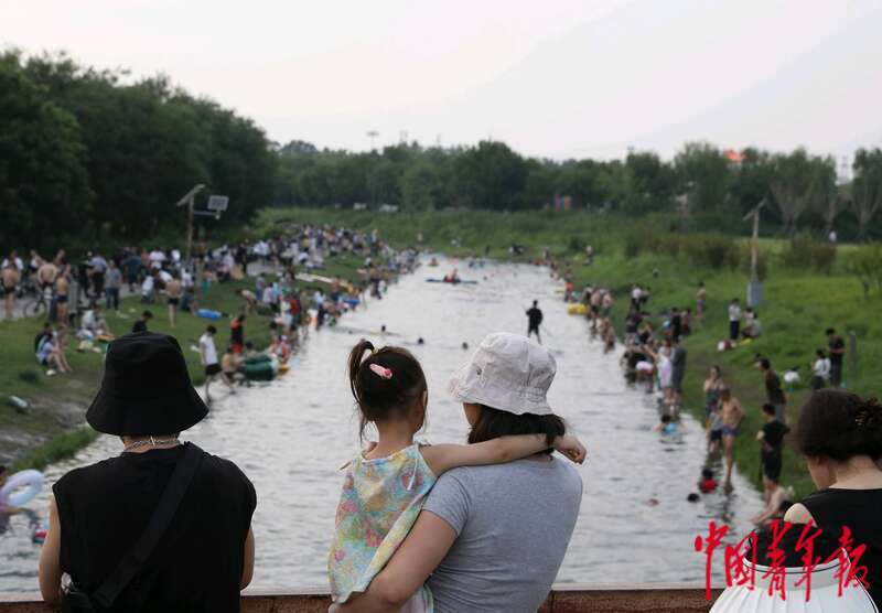 8月4日,位于北京中轴线南延长线旁的南苑森林湿地公园,桥上的群众看着在小龙河里嬉水的人们。中青报·中青网记者 陈剑/摄
