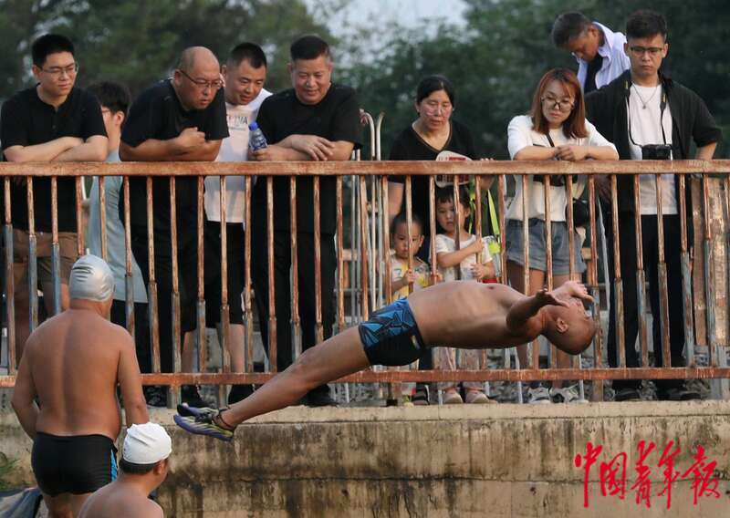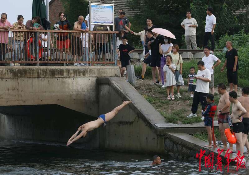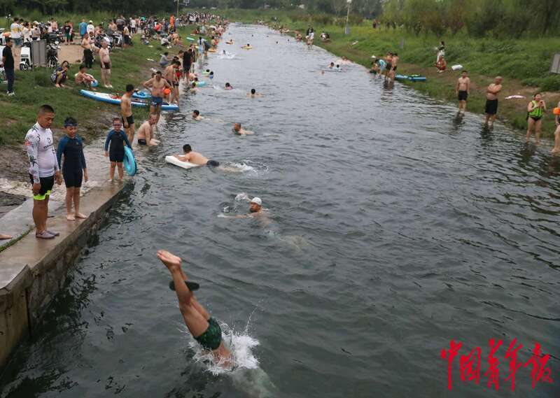 8月4日,位于北京中轴线南延长线旁的南苑森林湿地公园,市民自发在小龙河上进行跳水表演。中青报·中青网记者 陈剑/摄