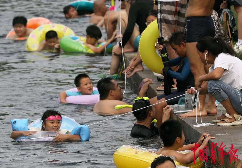 8月4日,位于北京中轴线南延长线旁的南苑森林湿地公园,小朋友们在小龙河里游泳玩耍。为了保证安全,一位在岸上的家长用长绳牵住戴在孩子身上的游泳圈。中青报·中青网记者 陈剑/摄