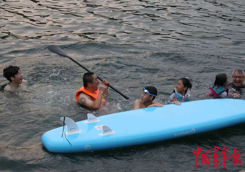 8月4日,位于北京中轴线南延长线旁的南苑森林湿地公园,小龙河里一只桨板发生侧翻,落水的人们忍俊不禁。中青报·中青网记者 陈剑/摄