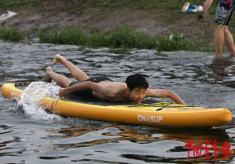 8月4日,位于北京中轴线南延长线旁的南苑森林湿地公园,小龙河上,一位少年趴在桨板上划水。中青报·中青网记者 陈剑/摄