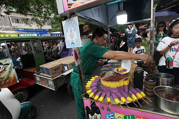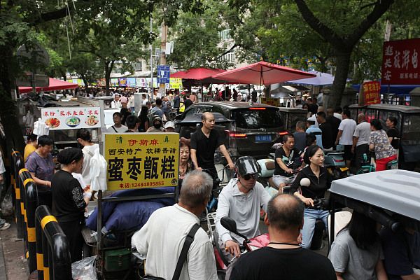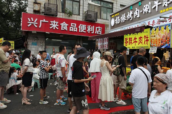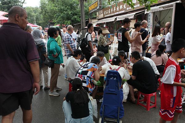 2024年8月4日,西安,回坊洒金桥人潮涌动,众多外地游客慕名前来品尝西安美食。