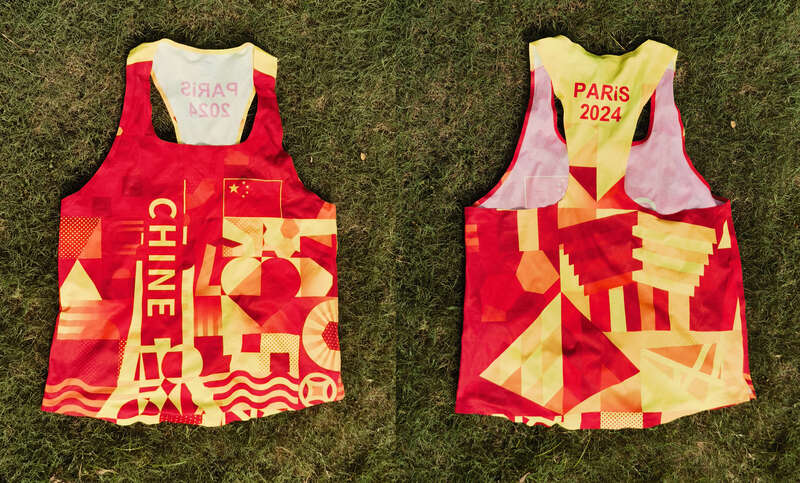 为了仪式感,李伦一干脆自己设计了一件奥运背心,将上海的东方明珠和巴黎的埃菲尔铁塔结合,再从两城的其他地标中抽象出一些线条,红黄配色,写上CHINE(法语“中国”)。他还制作了一条视频来阐述背心的设计元素,用语言学习App学了一些简单的法语,并且准备了一堆国旗。