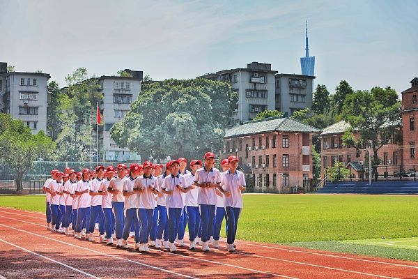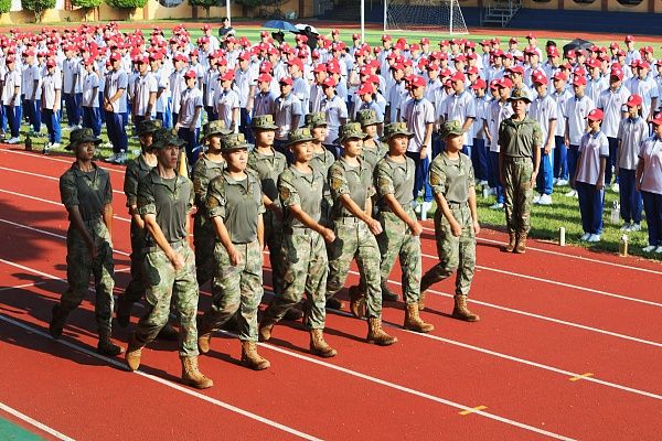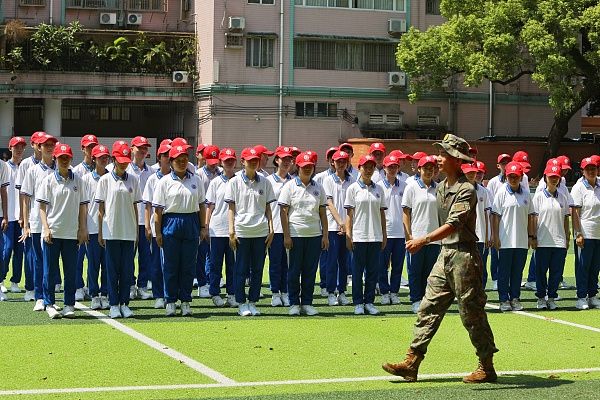 2024年8月5日,广州,培正中学2024年高一国防教育活动举行,烈日炎炎下,高一学子们在操场进行军训。