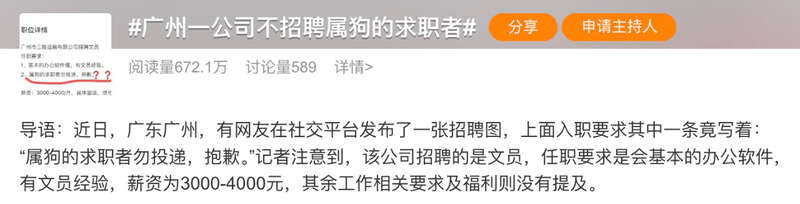 近日,广东广州一公司进行招聘,入职要求其中一条竟写着:“属狗的求职者勿投递,抱歉。”
