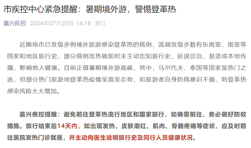 对此,嘉兴市疾控中心日前发布紧急提醒: 暑期境外游,警惕登革热。