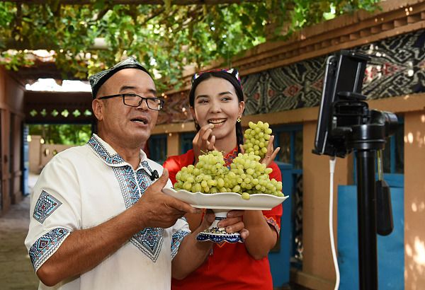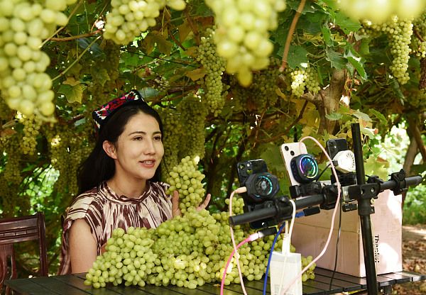2024年8月5日,新疆吐鲁番,当地网络主播在葡萄沟景区葡萄架下推介吐鲁番葡萄。