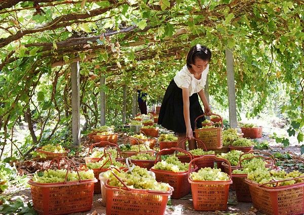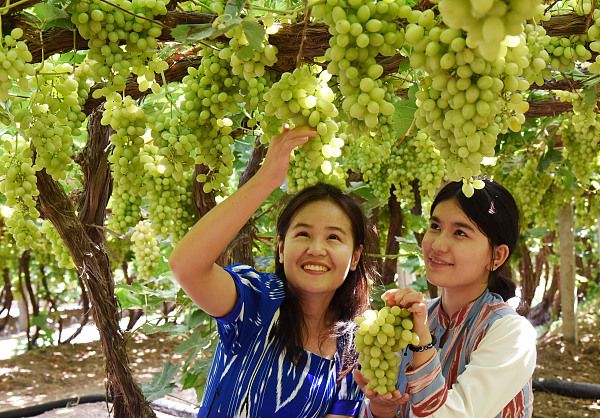 2024年8月5日,新疆吐鲁番,维吾尔族姑娘在高昌区亚尔镇夏勒克村采摘成熟的葡萄。