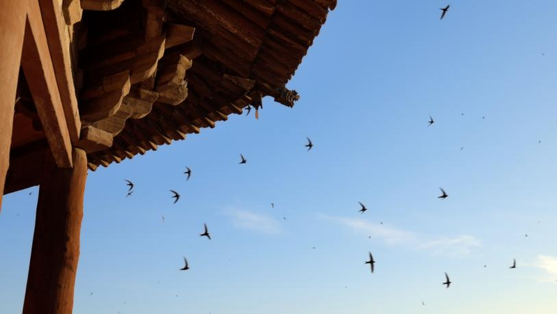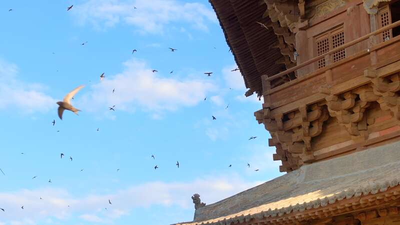 △应县木塔周围盘旋的鸟儿
