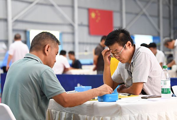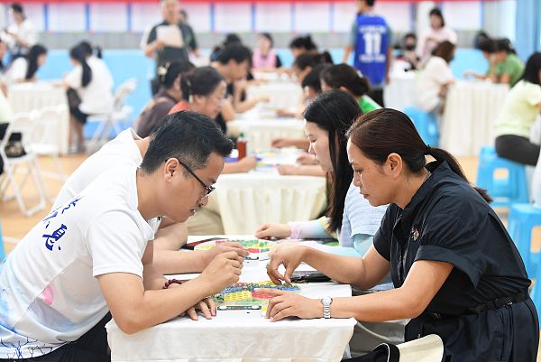 2024年8月7日,贵阳,两名参赛选手正在南明区第十届职工运动会跳棋比赛中对弈。