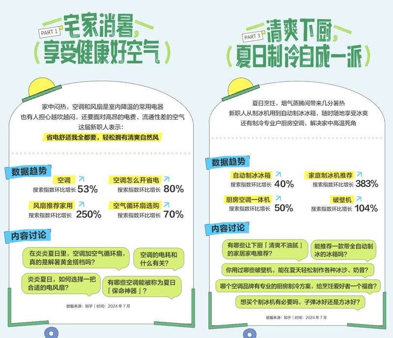爱玩“梗”的年轻人每到夏天集体“感恩”空调发明者——威利斯·开利,足见空调的重要性。随着节能、环保、健康理念的普及,这届年轻人对空调、风扇等消暑电器的需求更明确——省电舒适我全都要。报告显示,今年7月,知乎上“空调怎么开省电”搜索指数环比增长80%,“空气循环扇选购”搜索指数环比增长70%。