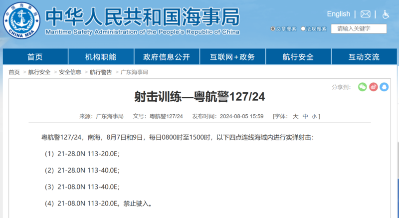 据中国海事局网站消息,广东海事局发布航行警告,8月7日至9日,每日8时至15时,南海部分海域实弹射击,禁止驶入。