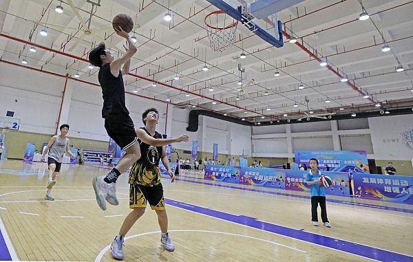 2024年8月8日,杭州上城区九堡阿里体育中心无需预约向大众免费开放,年轻人在篮球馆里尽情感受运动的快乐。