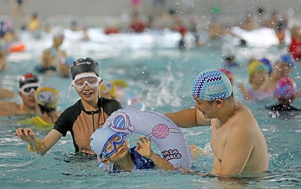 2024年8月8日,杭州上城区九堡阿里体育中心无需预约向大众免费开放,杭州上城区九堡阿里体育中心无需预约向大众免费开放,游泳馆里场面火爆。