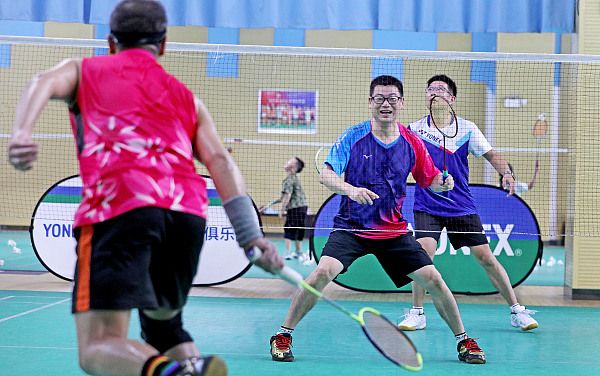 2024年8月8日,杭州上城区九堡阿里体育中心无需预约向大众免费开放,市民们在羽毛球馆里练习羽毛球。