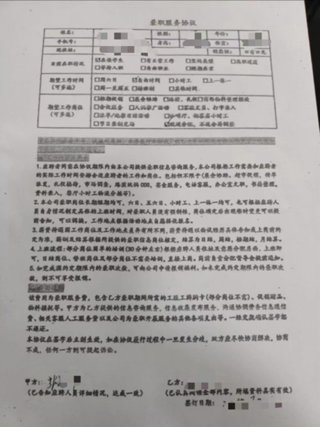 高余付款后,工作人员让他签署了一份《兼职服务协议》。其中显示,480元为兼职服务费,“包含乙方兼职期间所需的工服工牌胸卡(部分岗位不需)、促销赠品、物料损耗等”,此外还包括“甲方为乙方提供的信息咨询服务,信息收集发布服务,沟通协调劳务信息通信费、相关客服人工服务费以及公司为兼职开展服务的其他各项支出等”。