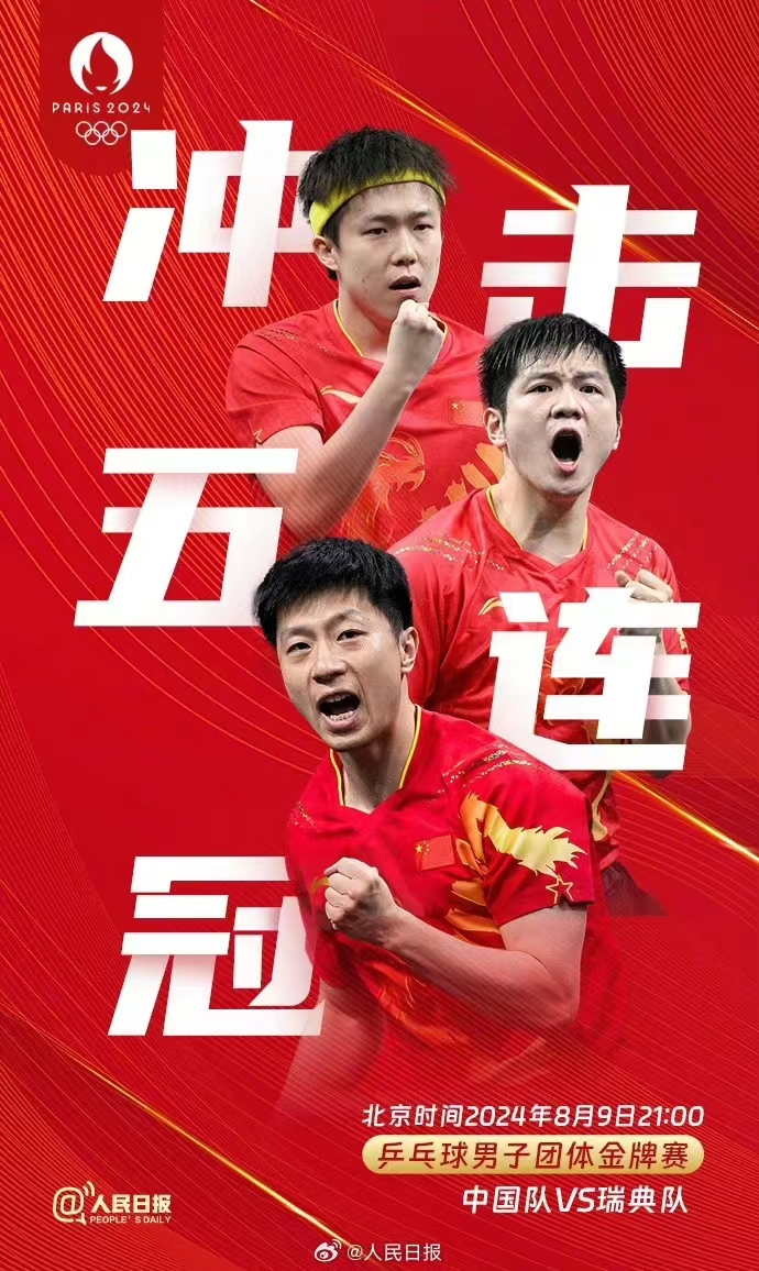今晚21:00,巴黎奥运会乒乓球男团决赛,中国乒乓球男团马龙、樊振东 、王楚钦对阵瑞典队,向奥运五连冠发起冲击。一起为他们加油,期待见证巅峰时刻!