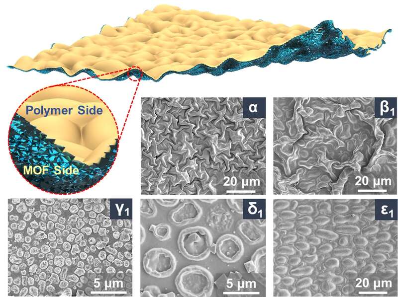 赵俊杰团队找到一种巧妙的方法,让MOF薄膜形成“皱褶”结构,在增加其活性表面的同时,还可以赋予其出色的形变能力。这种方法是基于“图灵机制”的方法,即1952年艾伦∙图灵(Alan Turing)提出的一种“反应-扩散”模型,用于解释自然界中图案形成的机制。