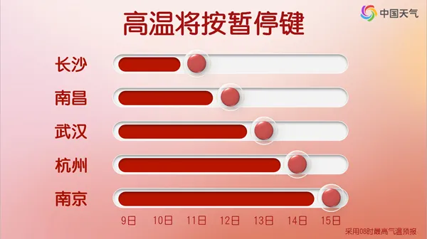不过,有些城市的高温只是短暂退场。像长沙、南昌、武汉、杭州等地的高温只是按下“暂停键”,未来还将卷土重来,强度较之前会有所减弱。