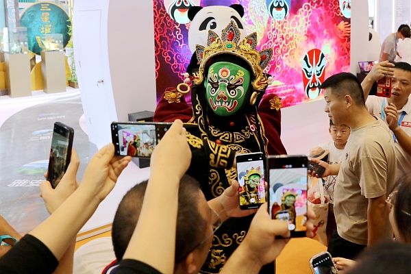 2024年8月9日,2024西安丝绸之路国际旅游博览会在西安开幕。本届博览会以“深化旅游合作·共享美好生活”为主题,旨在搭建国际交流合作平台,全面展示旅游业的最新成果与未来趋势。图为变脸表演吸引参观者。 中新社记者 张远 摄