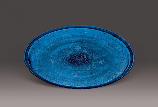据地宫出土的物账碑记载,整个地宫被布置得“穷天上之庄严,极人间之焕丽”。在这些文物中,有6件来自阿拉伯国家的刻纹蓝玻璃盘。展览中的这件玻璃盘保存完好,为无模吹制成形,通体蓝色,晶莹光洁,盘面刻满纹饰,主体纹饰为以双线勾勒出的十字形框架,盘心为正方形方框,方框外刻四个拱门形状的尖瓣,与中心方框组成四个“米哈拉布”纹样。