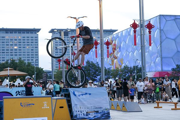 2024年8月8日晚,北京奥林匹克公园,爱好者在练习自行车登高技巧,吸引了市民游客围观。 中新社记者 贾天勇 摄