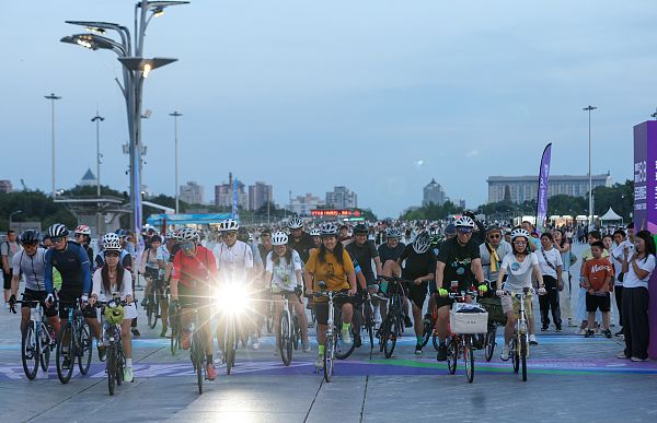 2024年8月8日晚,北京奥林匹克公园,北京奥运城市体育文化节开展的“畅骑中轴线”骑行活动吸引近400位老中青骑友、骑游爱好者和市民游客,打卡“北京中轴线”北延长线。 中新社记者 贾天勇 摄