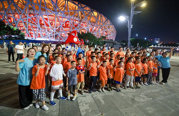 2024年8月8日晚,北京奥林匹克公园内,研学旅游的小学生们在拍合影。奥林匹克公园成为暑期北京的热门打卡地。 中新社记者 贾天勇 摄