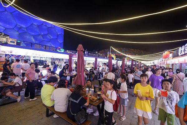 2024年8月8日晚,北京奥林匹克公园内的夜市生意兴隆,客流众多。 中新社记者 贾天勇 摄