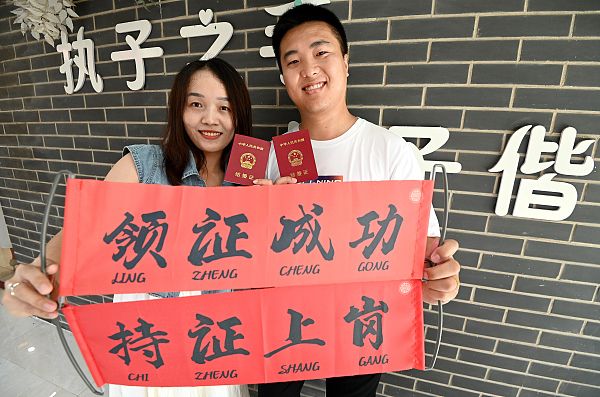 2024年8月10日,一对新人在河北省邯郸市丛台区民政局婚姻登记处展示刚刚领取的结婚证。