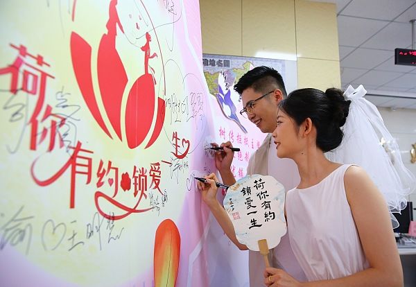 2024年8月10日,山东枣庄,一对新人在滕州市民政局婚姻登记处的“荷你有约·锁爱一生”爱心墙上签名。