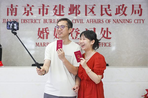 2024年8月10日,南京市,一对新人在建邺区婚姻登记处领证后合影留念。