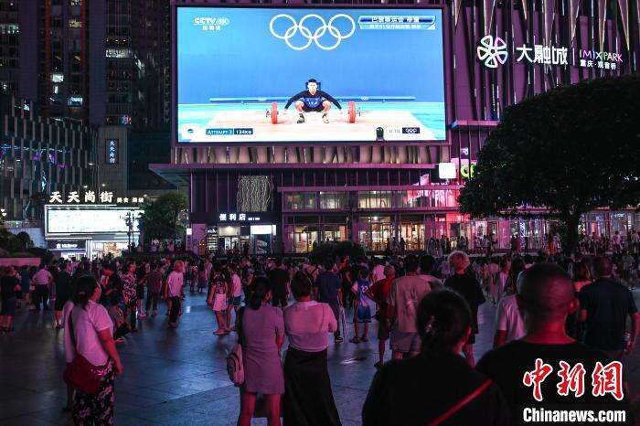 9日晚,影院外,观音桥商圈的户外大屏上则播放着巴黎奥运会举重项目男子61公斤级决赛。从上海到重庆来旅游的一家三口仰头观看,不时举起手机拍下眼前的画面。这家人中的丁姓先生说,平时工作忙,不会特意去看比赛,现在这种形式很不错,感觉一家人也融入了奥运氛围中。
