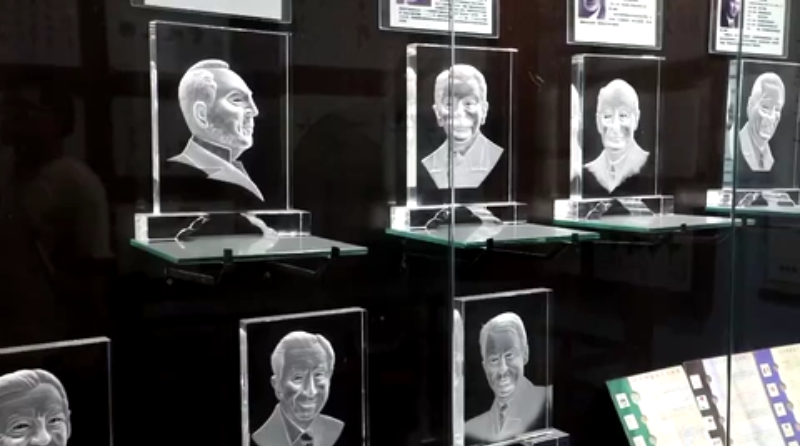 除了探索“接地气”的产业模式,吴氏玻雕在技艺上不断创新、开拓。传统的台州玻雕以花鸟、山水为主要雕刻内容,吴氏玻雕第二代传人吴刚则突破传统,将肖像作为玻雕的一项重要主题,创作了大量国内外名人肖像玻雕作品。
