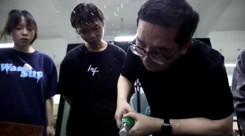 近日,在台州职业技术学院艺术学院,浙江省工艺美术大师金树立正为学生们演示玻璃雕刻技艺。