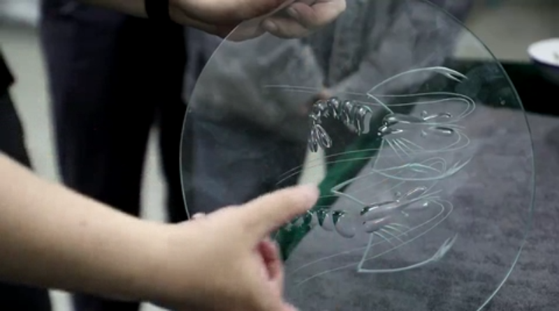 他使用天台金氏玻雕独创的手持砂轮工具,在一块玻璃上划动数下,一只虾的模样就显现了出来。